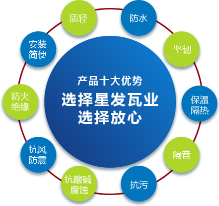 公司主要產(chǎn)品有《星發(fā)牌》合成樹脂瓦、APVC防腐耐候復(fù)合瓦、APVC發(fā)泡隔熱瓦、PVC半透明瓦、PVC防腐隔熱瓦、PVC防腐瓦、PVC防腐平板、PVC條紋板和ASA/PVC超耐候復(fù)合瓦等產(chǎn)品。產(chǎn)品一經(jīng)推出,已被廣泛應(yīng)用于國內(nèi)各類平改坡項目和大型工業(yè)項目,遠(yuǎn)銷歐洲、亞洲、美洲和非洲等國外市場,還獲選為廣州亞運會、深圳大運會、四川災(zāi)后重建等工程項目的應(yīng)用產(chǎn)品。公司在不斷創(chuàng)新和改革的基礎(chǔ)上,力求以更好的產(chǎn)品、優(yōu)良的服務(wù),用心、專心服務(wù)好每一個客戶。